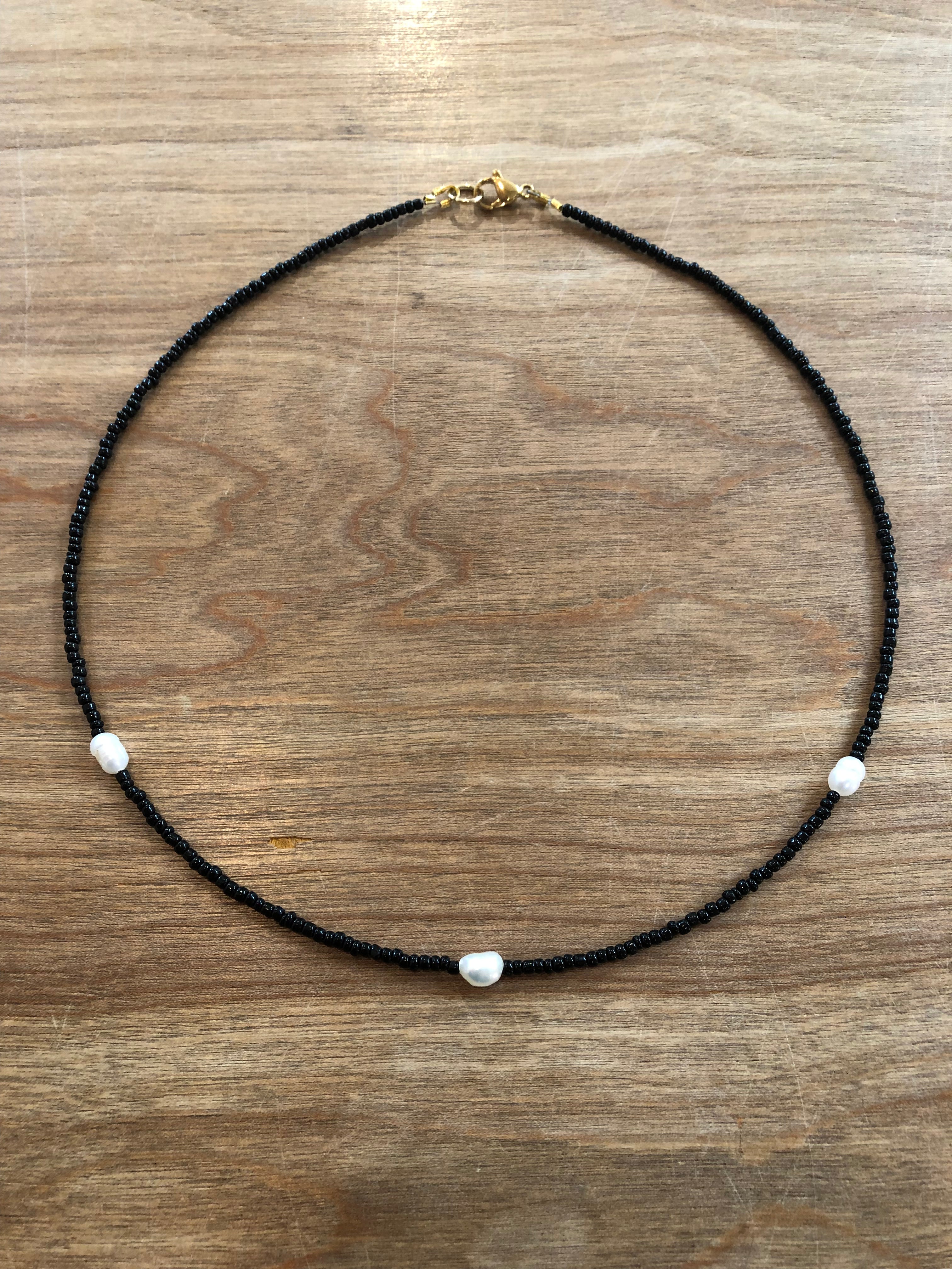 Available in three styles - bright red glass beads with 5 smaller fresh water pearls, chartreuse glass beads with 5 smaller fresh water pearls or black with 3 fresh water pearls.