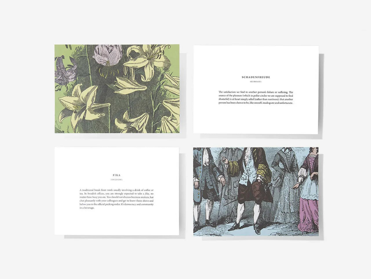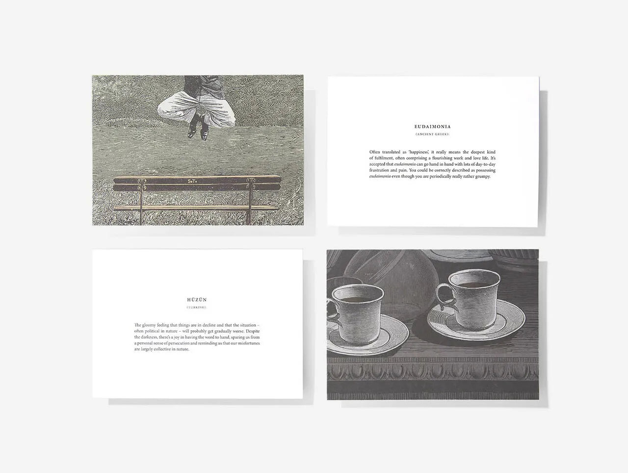 This set of cards define some of our favourite words from the world’s languages and married them up with complementary images to create cards that bring some of our most important feelings into focus. We’ve created them to prompt greater reflection about the nature of language and the emotions.