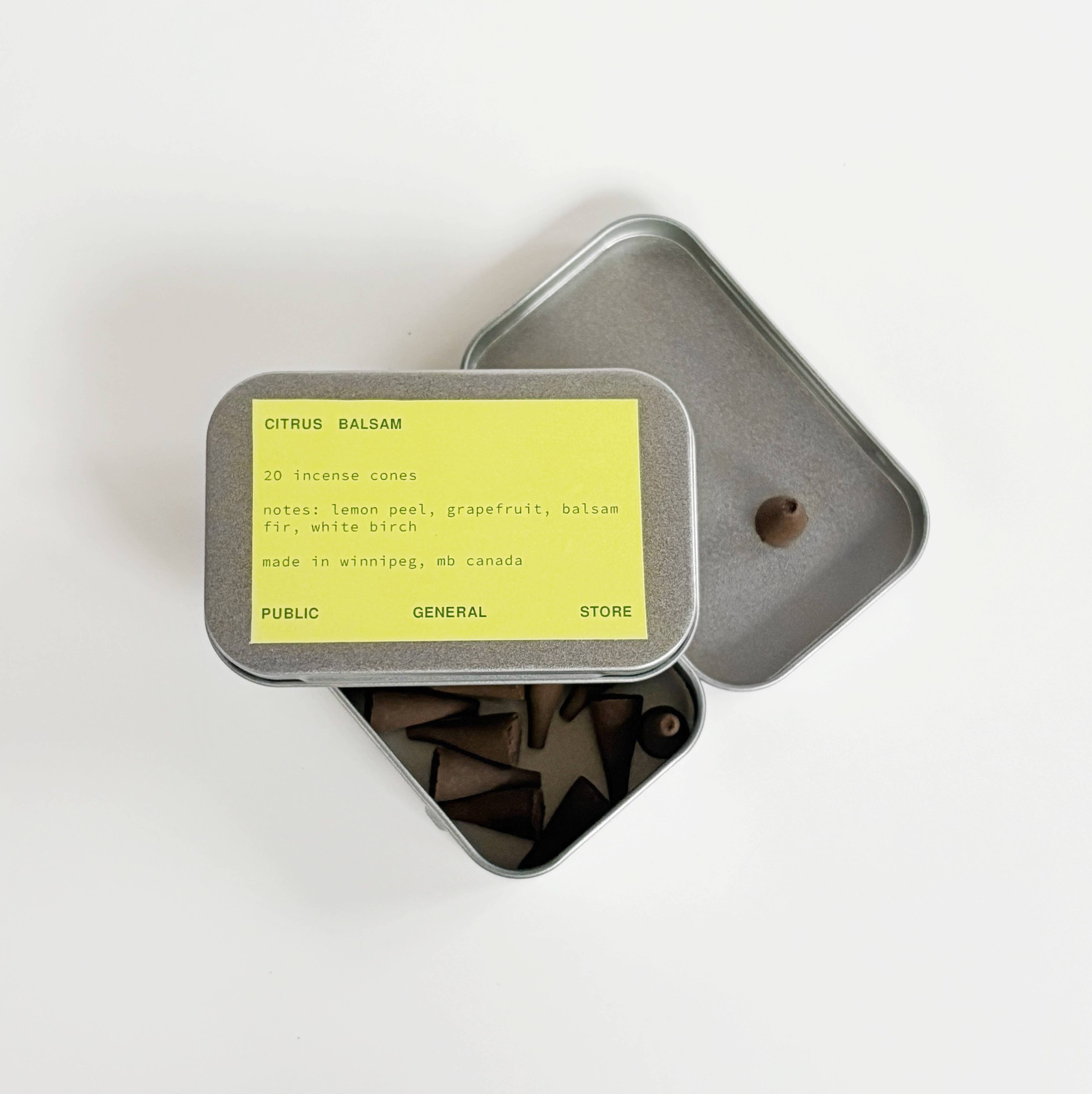 Each tin includes 2O incense cones, soaked in our hand-blended signature fragrances. Our cones are made from pressed ground bamboo and joss tree powder with a burn time of 30 minutes - the scent lingers in the air for much longer. Scent notes: lemon peel, grapefruit, balsam fir, white birch How to burn: Light the tip of the cone with a match or lighter for 10-15 seconds until it glows, and then gently blow out the flame. Place it on a heat-proof burner - the cone will smolder and release smoke on its own.